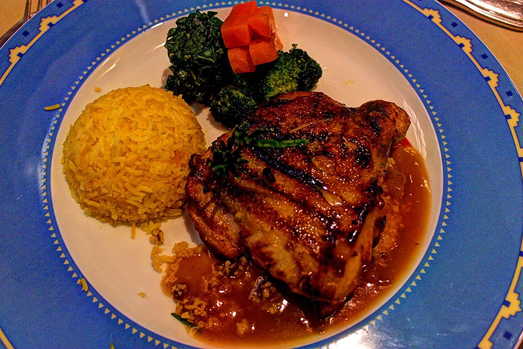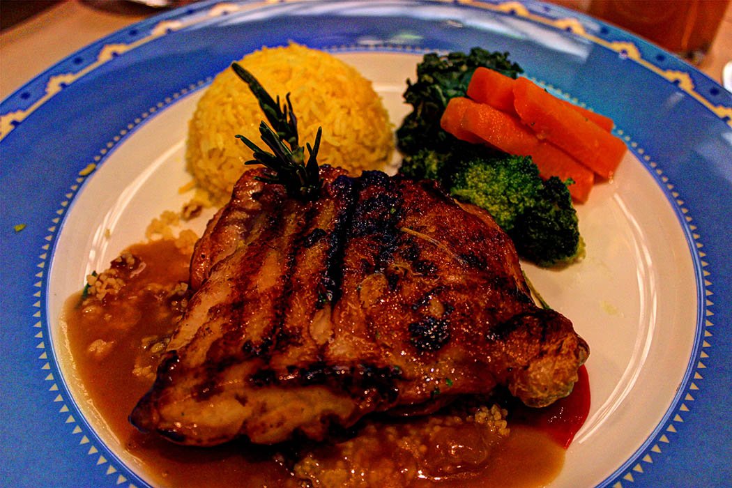 The main course was  lemon chicken . The delicately grilled chicken ballotine was set on orange couscous. The chicken was accompanied by saffron rice and fresh market vegetables.