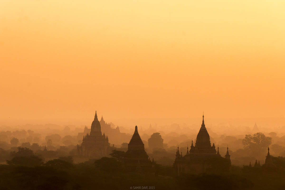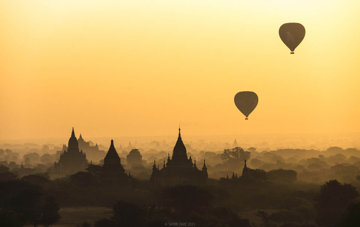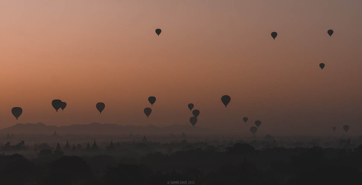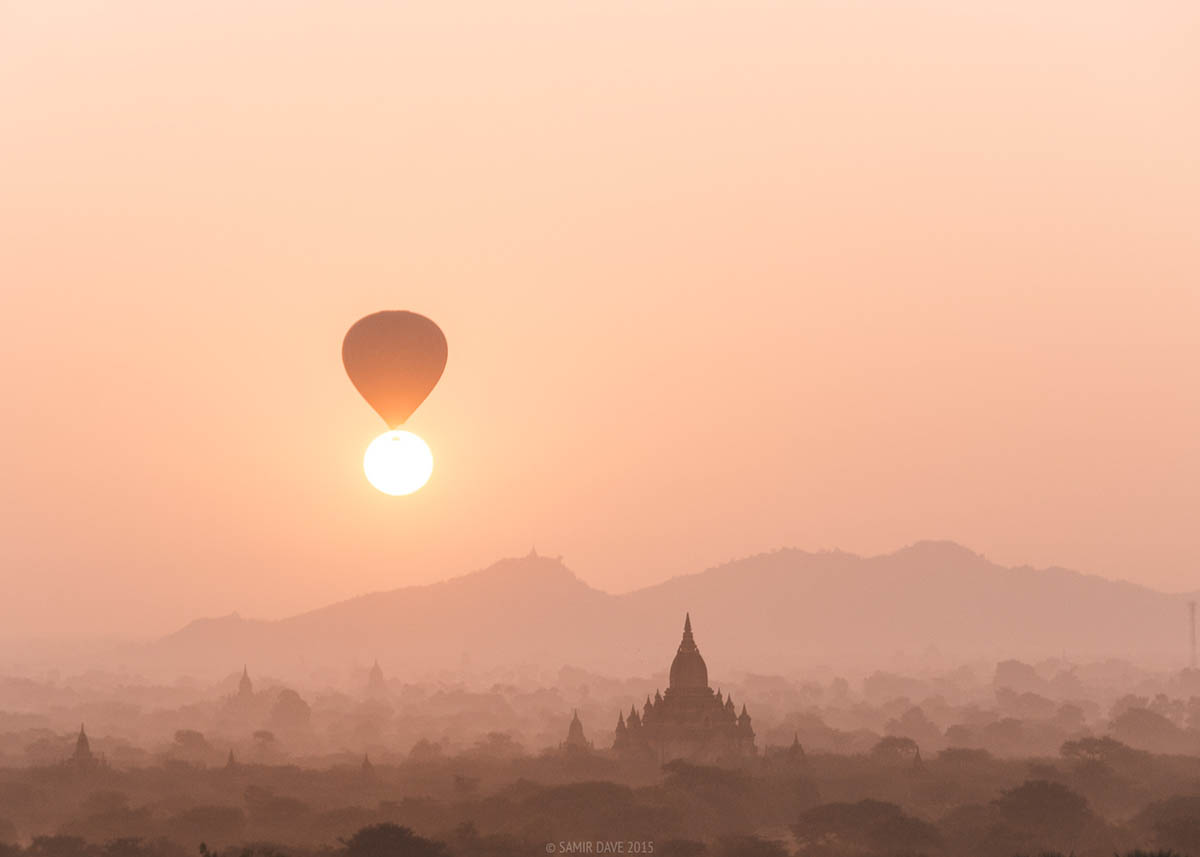 Saffron Sunrise. A balloon floating over the temples of Bagan in the morning