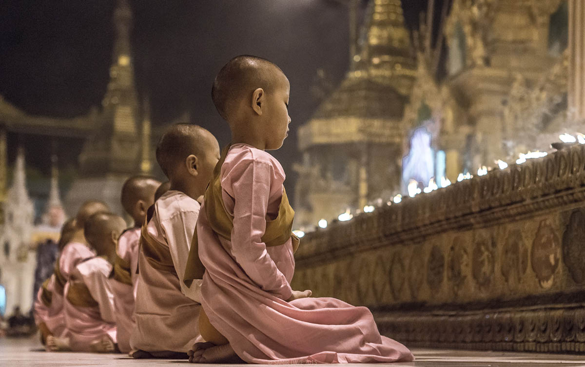 Each evening, novice female monks perform a candle lighting ceremony at Shwedagon pagoda. Once done, they sit, pray and meditate a while before leaving.
