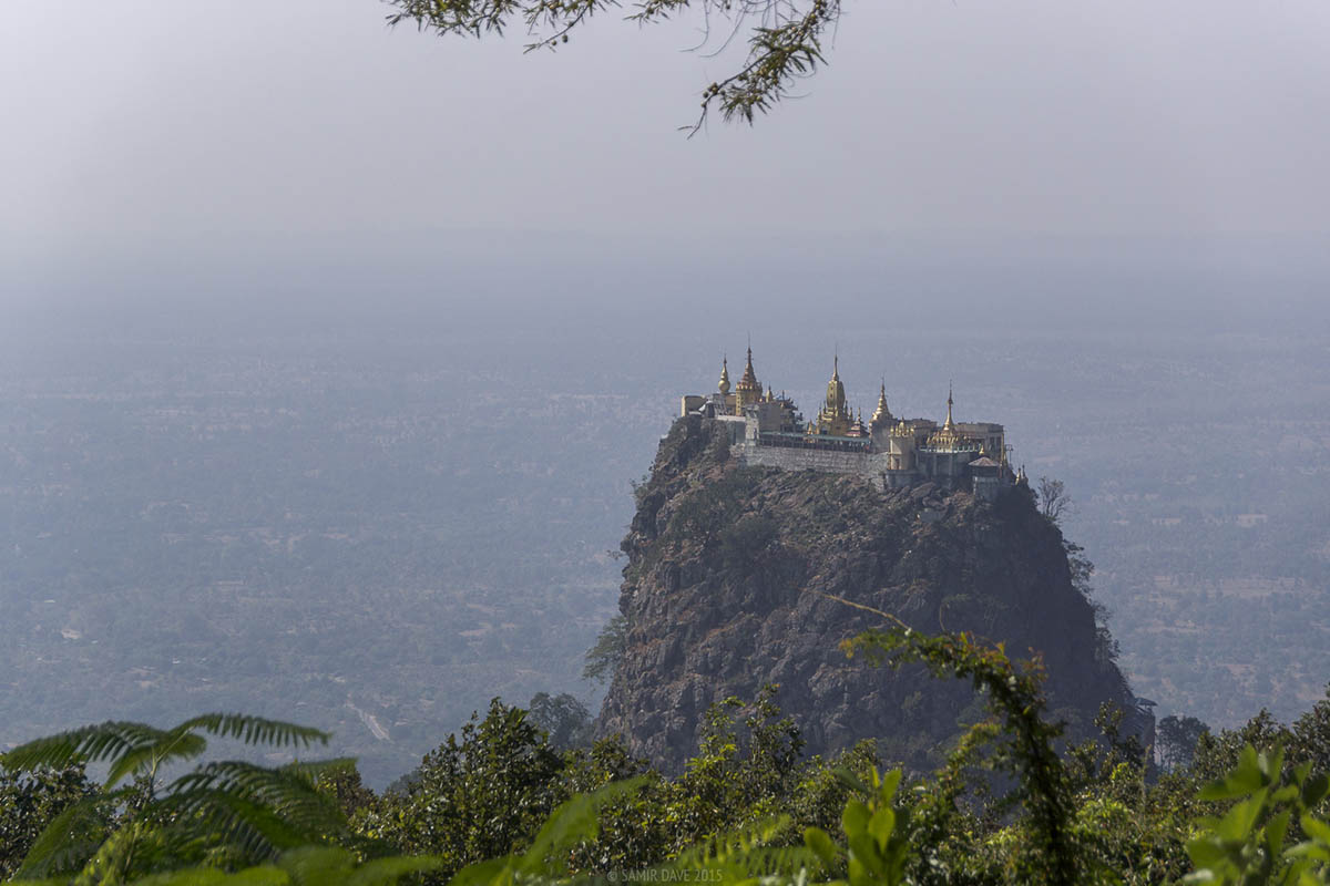 One more of the many touristy spots we went to was a “viewing point” on Mount Poppa from where you could see Taung Kalat. This is a monastery built atop a volcanic plug. The guide even pointed out that the overhanging leaves would add a key framing element. I obliged.