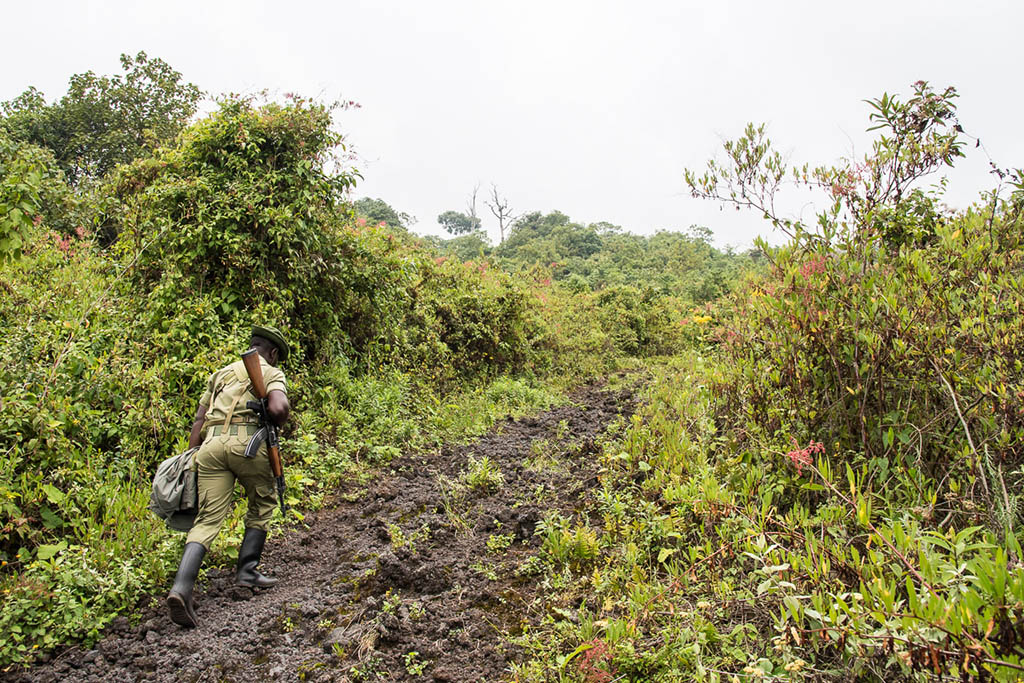 We set off at 9:30 am on the trail heading to the volcano after some instructions from one of the rangers. The current security situation in the Southern Virunga National Park around Nyiragongo was said to be stable allowing us to hike in a calm atmosphere surrounded by armed rangers in the front and the back. On the way up we came across three ranger outposts equipped with machine guns. Upto 30 rangers secure the trail up to the volcano, a tough job as there is no shelter and heavy rain falls almost every day. We were supposed to be a group of four this day, but another group of 12 from Czech Republic who had missed their ferry across Lake Kivu from Bukavo to Goma two days ago, joined us.