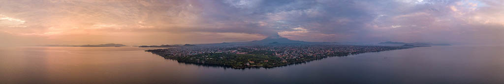 The view from lake Kivu to Nyiragongo volcano and the city of Goma on the right