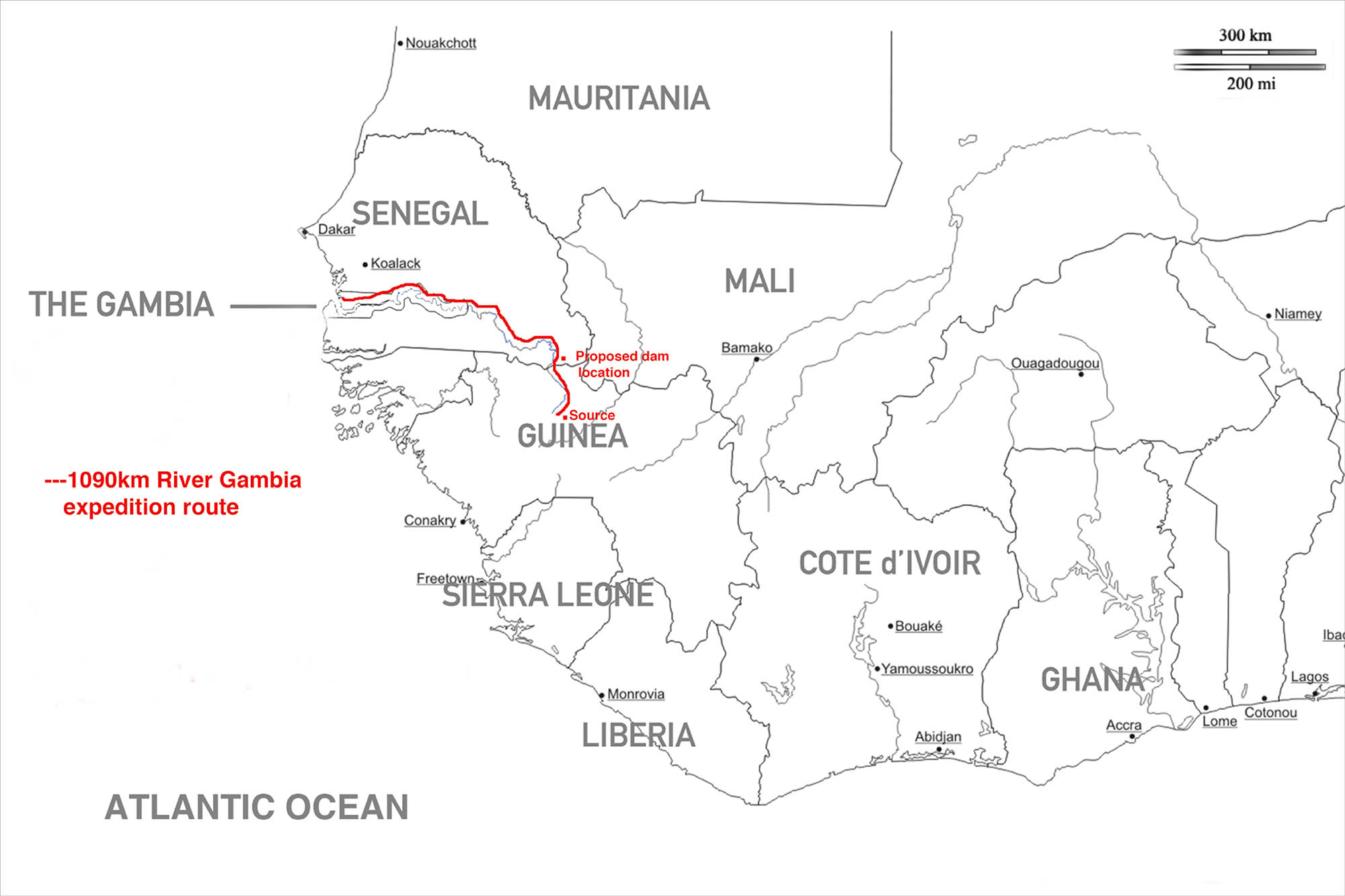My wife, Helen Jones-Florio, and I co-led the first recorded source-to-sea expedition along the length of River Gambia, from its humble source in the remote highlands of Guinea, through Senegal and into The Gambia where it widens to nearly 14km and exits into the Atlantic Ocean. We teamed up with two old Gambian friends, Abdou Ndong a fisherman and Ebou Jarju a school teacher, as our river guide and translator.