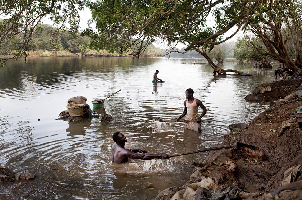 Gold mining along the River Gambia as it flows through Southern Senegal draws economic migrants from all over West Africa. The gold bearing sand is filtered and then mixed with mercury to draw the gold out.
