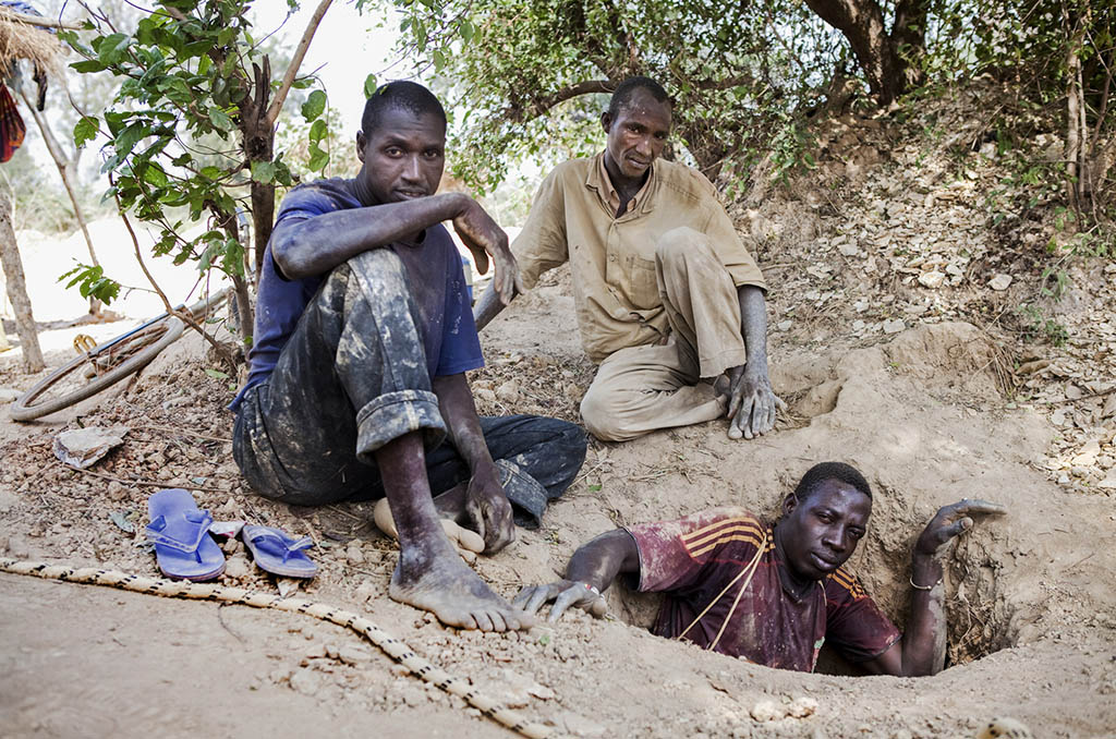 A Senegalese gold miner appears from the small shaft from where he is extracting gold bearing rocks. His two partners help haul the loaded bucket up to the surface. Mines shafts often collapse and many people are killed each year in their pursuit.