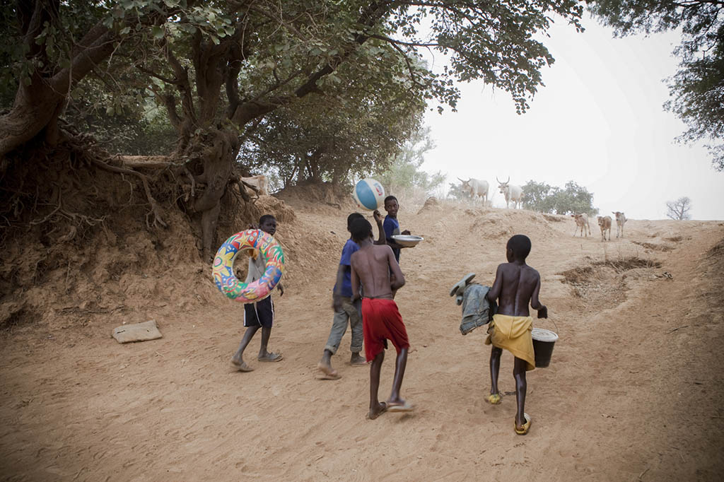 Boys head home after swimming in River Gambia at Fatta Tenda village, Gambia