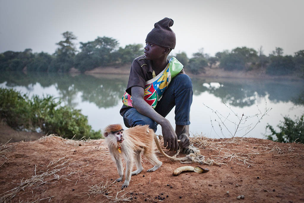 Musa with a rescued patas monkey on the banks of River Gambia at Fatta Tenda