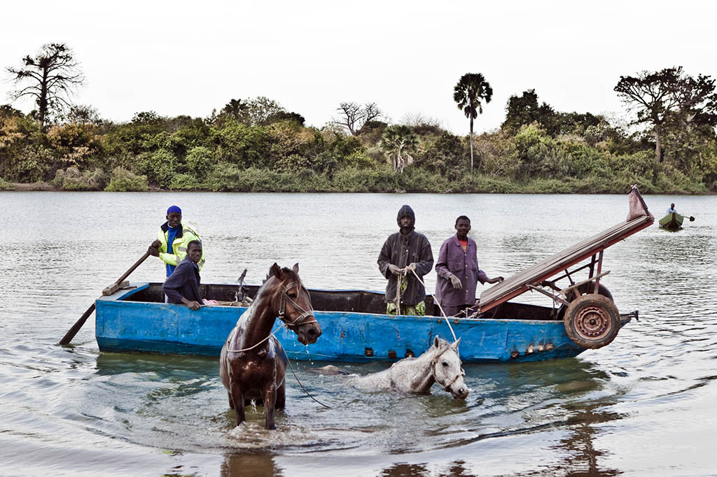 Fula men swimming their horses across River Gambia at Karantaba Tenda on their way to sell their crop of peanuts.