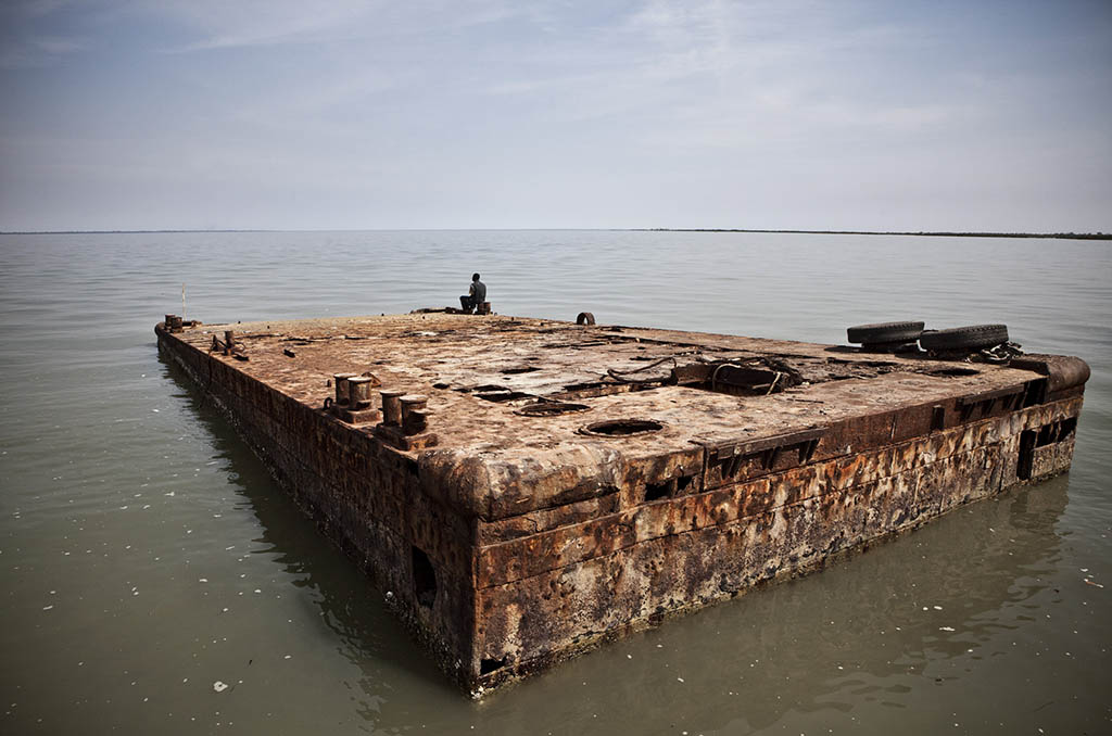A watchman relaxes on a jetty at the Gambian village, Bonto. Bonto became infamous in 2009 when a two-tonne cocaine stash, with a street value of $1bn, was discovered in a riverside warehouse next to the jetty. The street value of the haul far exceeded Gambia’s $782 million annual GDP in 2009. The river at this point is 14km wide
