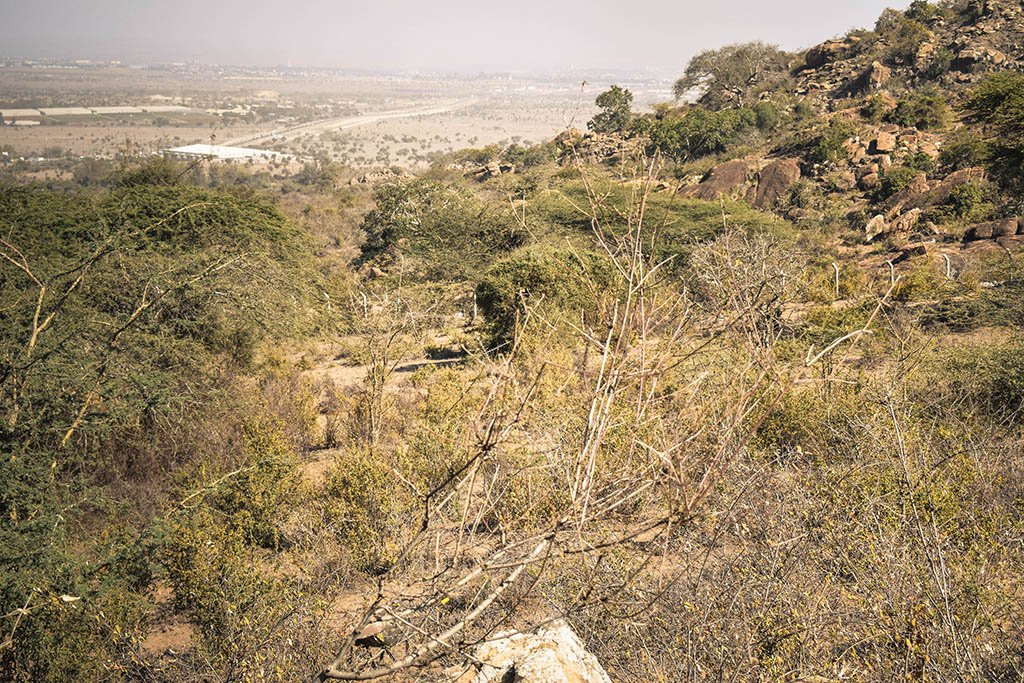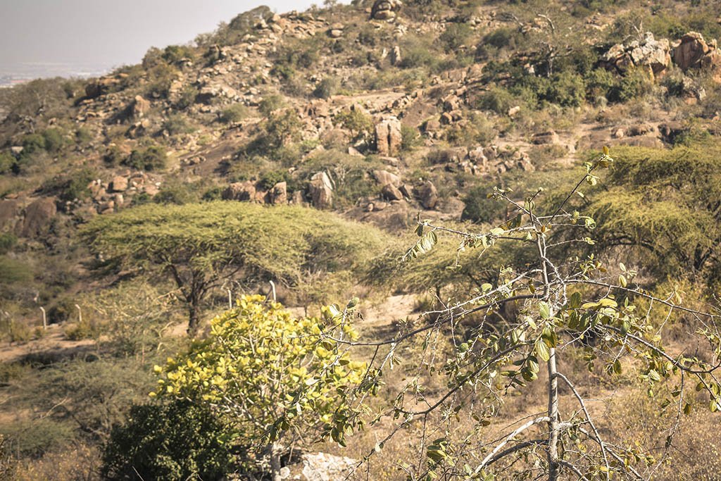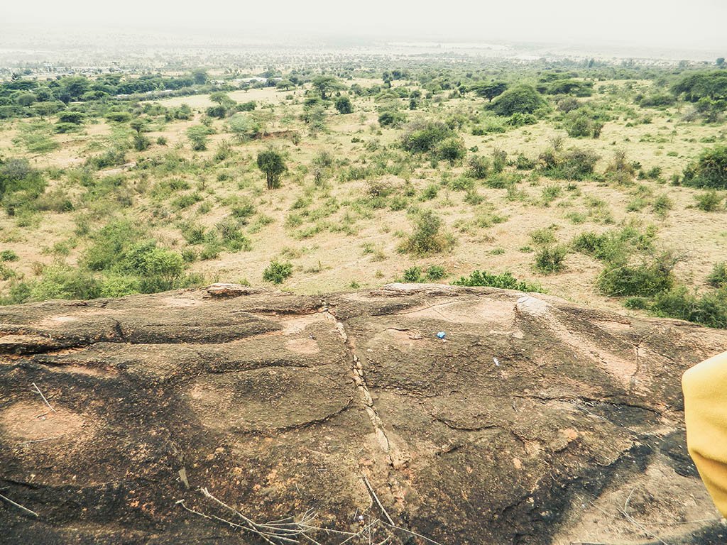 The hike consisted of a gentle ascent through the bushes and boulders. Once in a while the trail would break through the bushes to reveal distant views of traffic along the Nairobi – Mombasa highway. Gingerly stepping over the rocks, occasionally getting my feet caught in the winding not so clear trails, I steadily made my way up. With scattered dry land thorny bushes providing the only cover from the blistering sun an expansive rock section finally came into view.