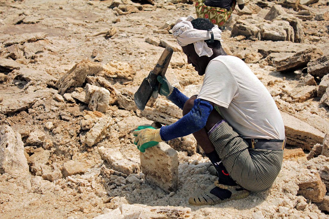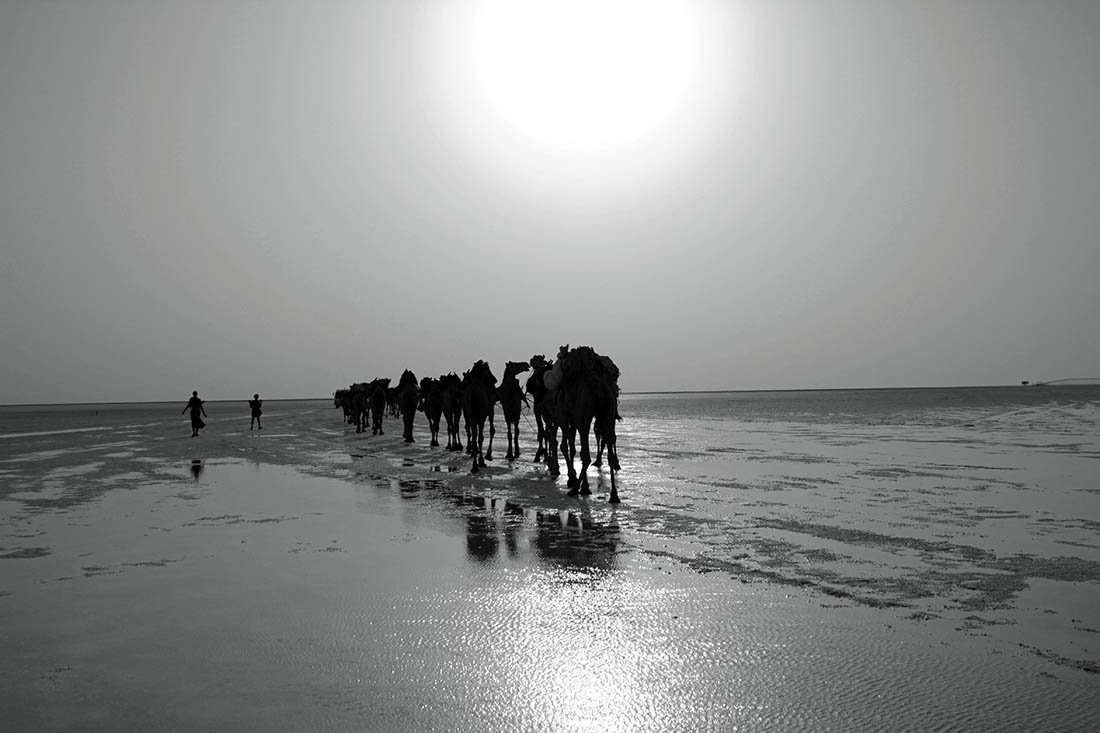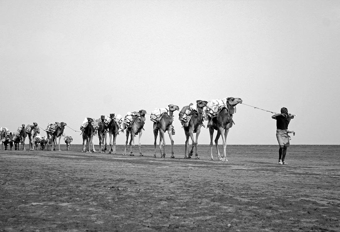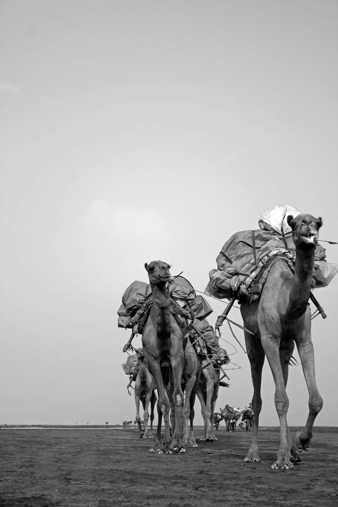 The Afar people use the old method of cutting out a chunk of salt and then shaping it with a simple salt-shaper into a perfect square block about five centimetres thick, which they then pile up eight pieces high. Once all the salt is collected, they load up the camels, tethered to each other nose-to-tail, and walk them out to local towns and villages.