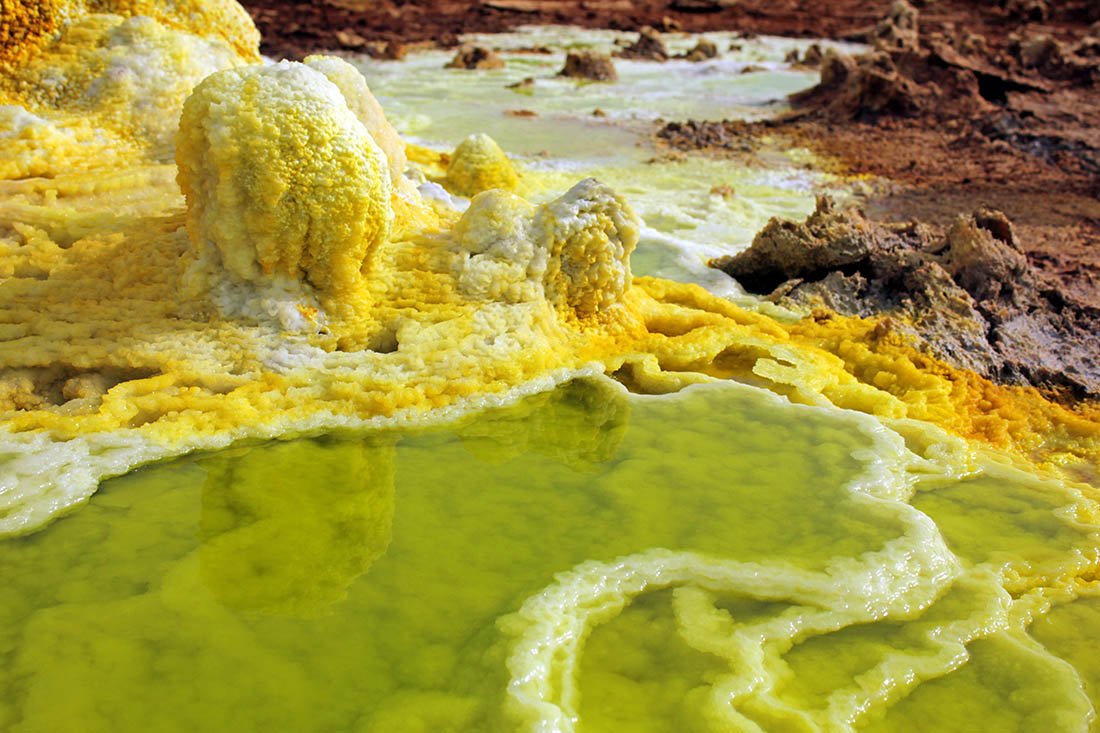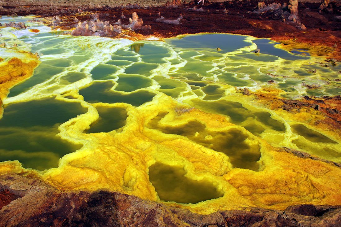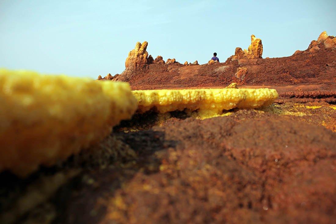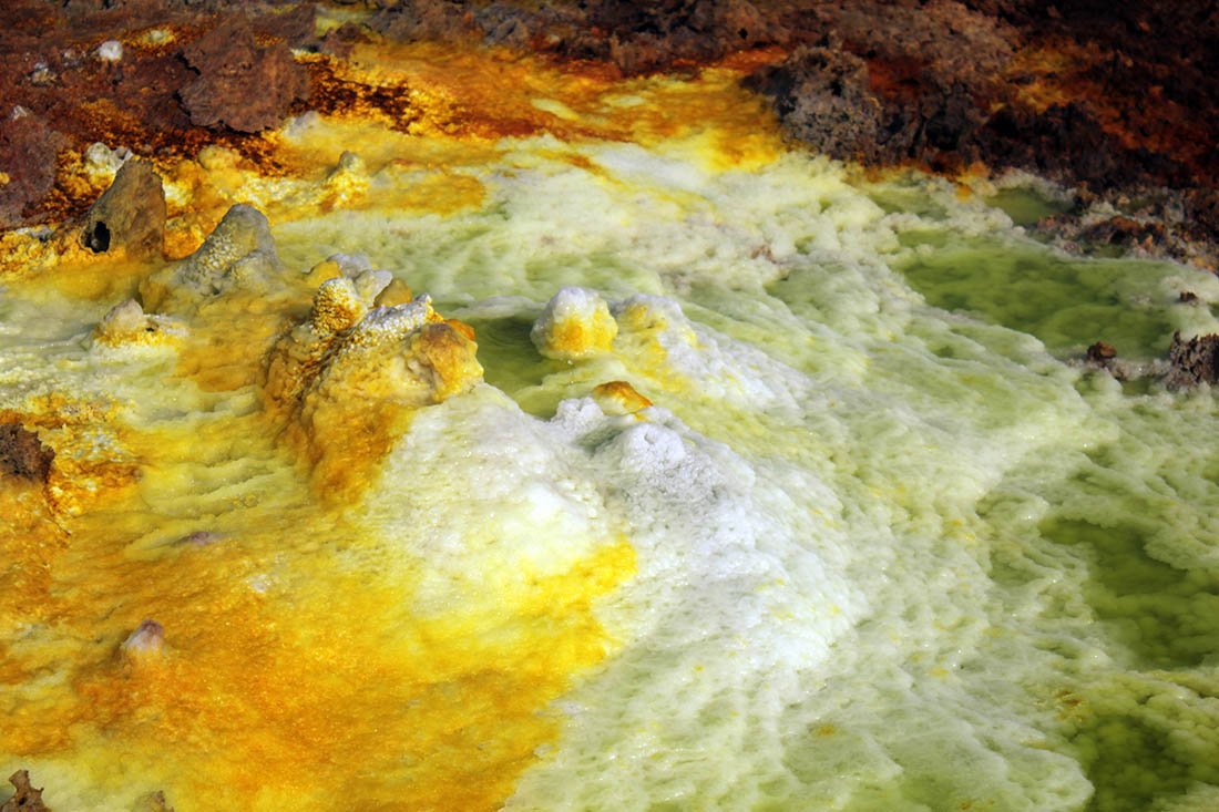 “Wow,” I exclaimed. Before me was an alien surface, the likes of which I have never come across on this planet. It was desert red with patches of yellow pools of sulphur – hot boiling water points where salt crystallised into small stalactites with green pools of potassium surrounding them.