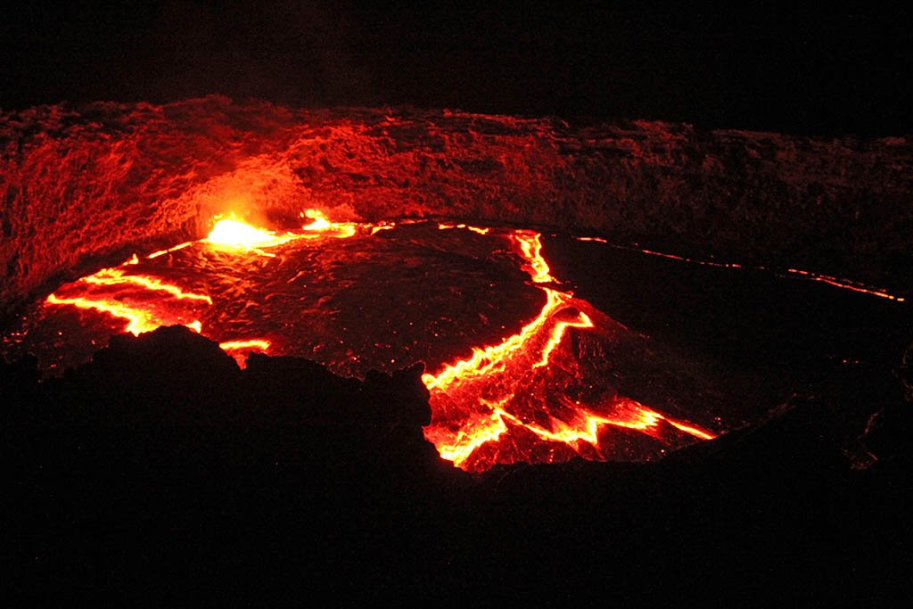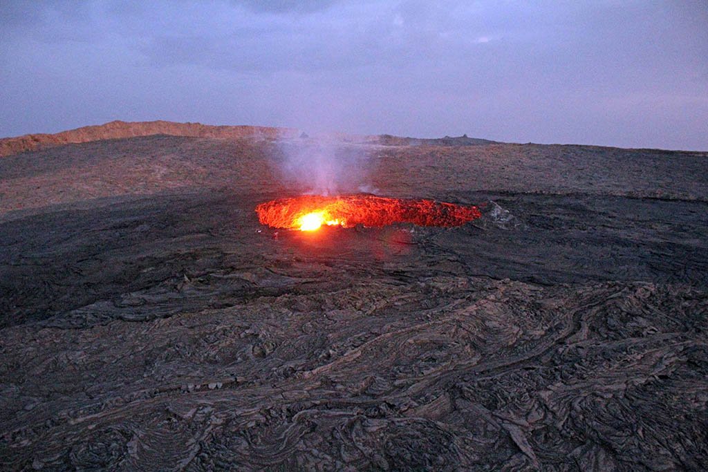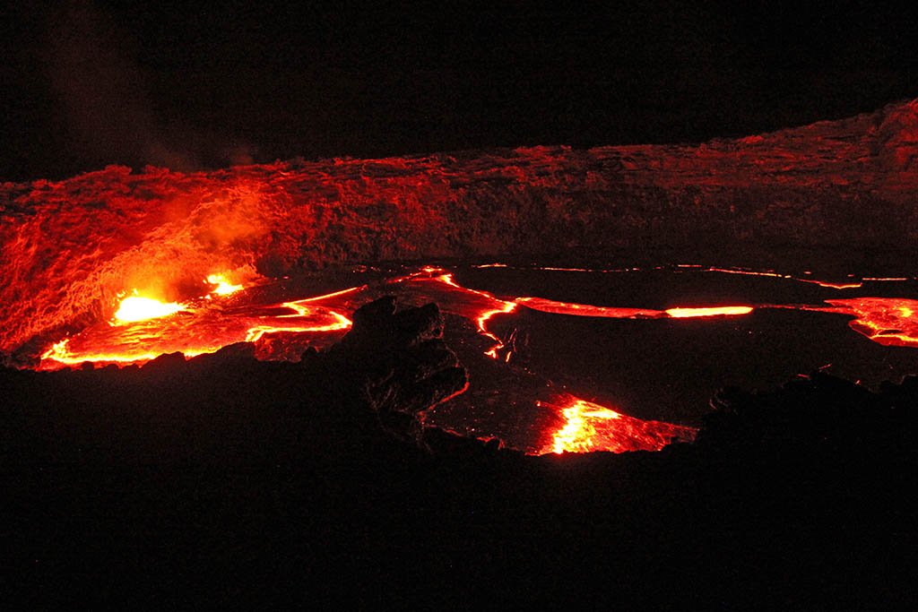 We followed him down the incline and into the inner crater. The red glow of the lava lake was just a short hike across solidified sheets of lava that moved when stepped on. Deep holes and sharp shards where strewn about like bad housekeeping. I stepped on one plate that made me feel like I was about to be swallowed up.