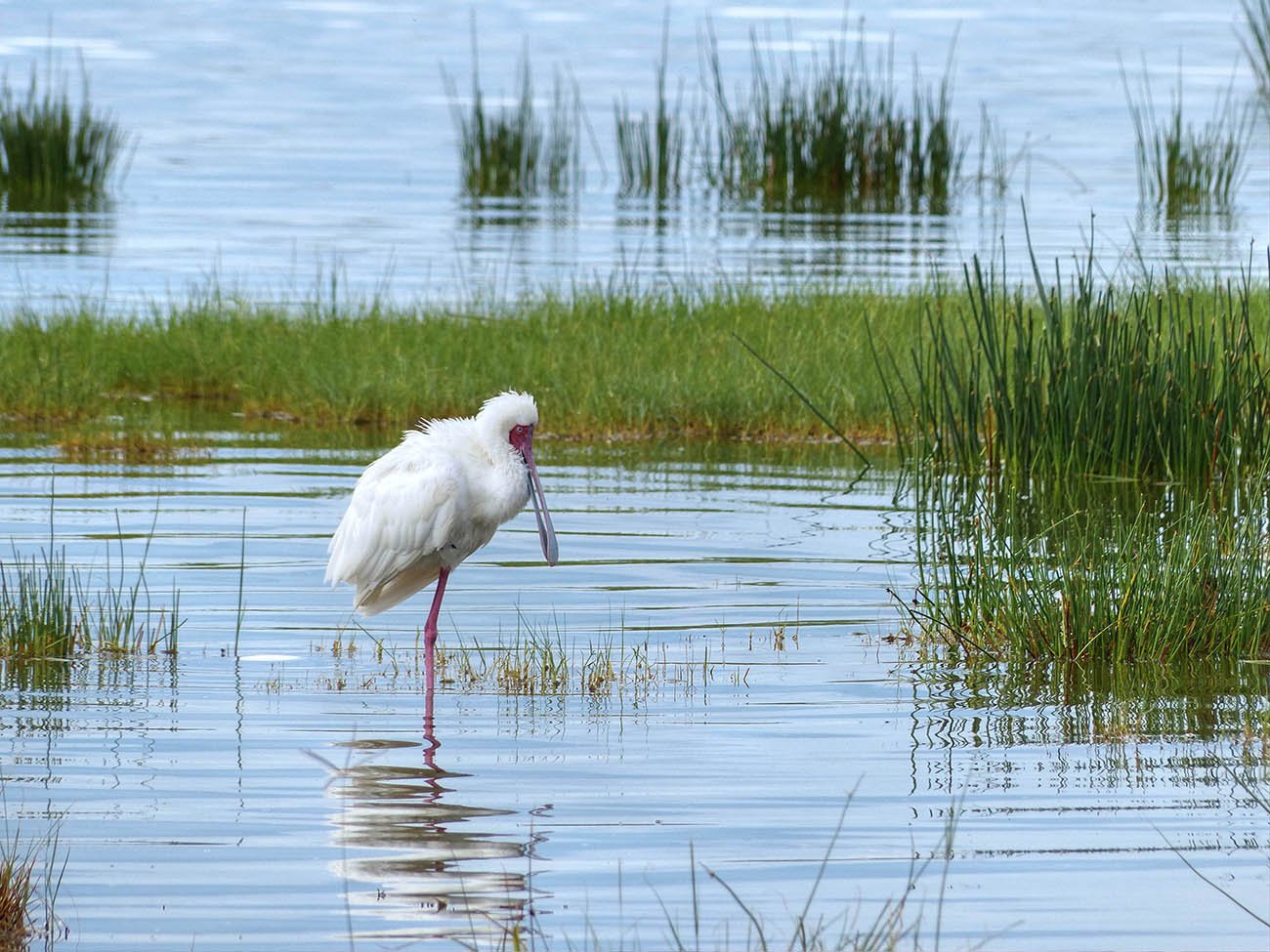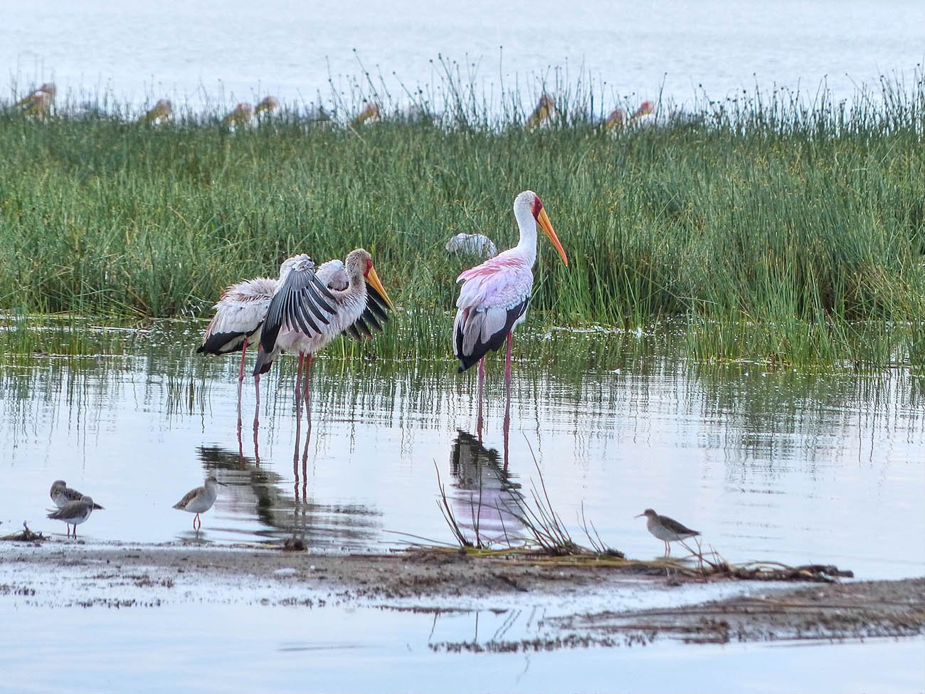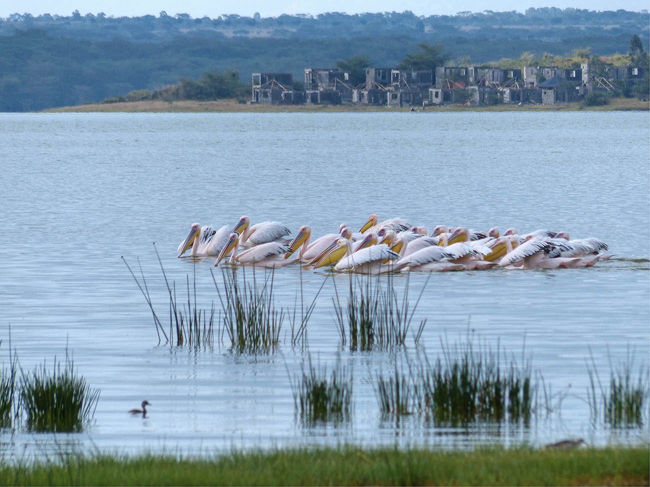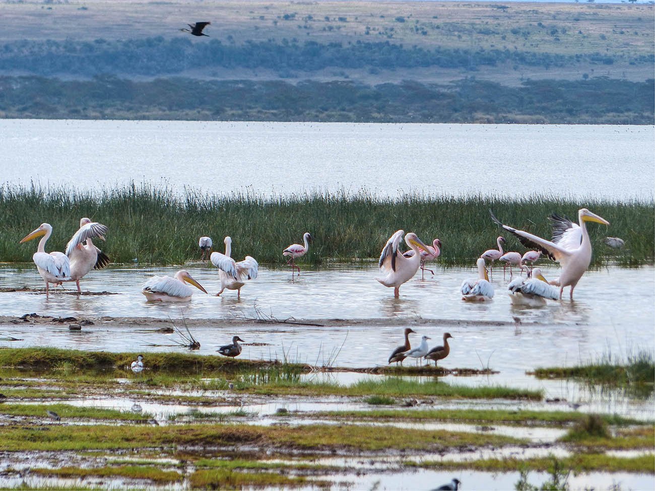 Bird-watchers will relish a trip to Lake Elementaita, the lake basin area has over 400 recorded bird species, among which 13 are globally-threatened and 8 are regionally-threatened. Elmenteita attracts visiting flamingoes, both the Greater and Lesser varieties, which feed on the lake’s crustacean and insect larvae and on its suspended blue-green algae. A number of low, rugged, lava-rock islands in the shallows are the nesting site of the Great White Pelican, the lake hosts an estimated 8000 breeding pairs. Additionally the Lake is an important flyway passage and stopover for migrant birds from northern Asia and Europe, hosting over 100+ species of migratory birds. Some of these include the yellow billed stork and marabou stork, African spoonbill, black winged stilt, black-necked grebe, gull billed tern, little grebe, grey-headed gull and pied avocet.