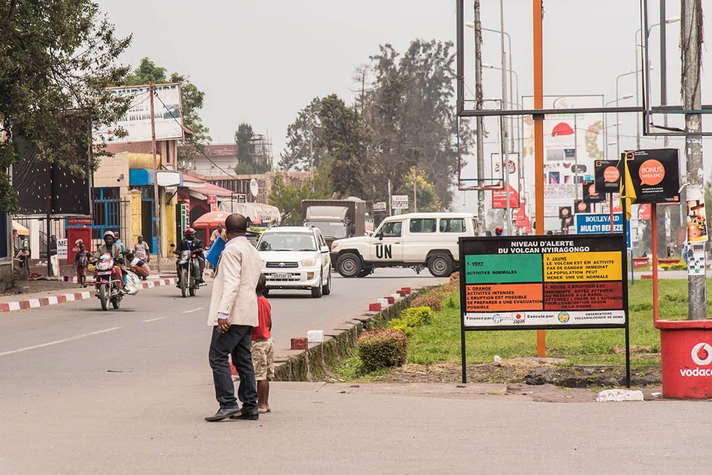Signpost with a color system showing the current status of the volcano are present everywhere in Goma