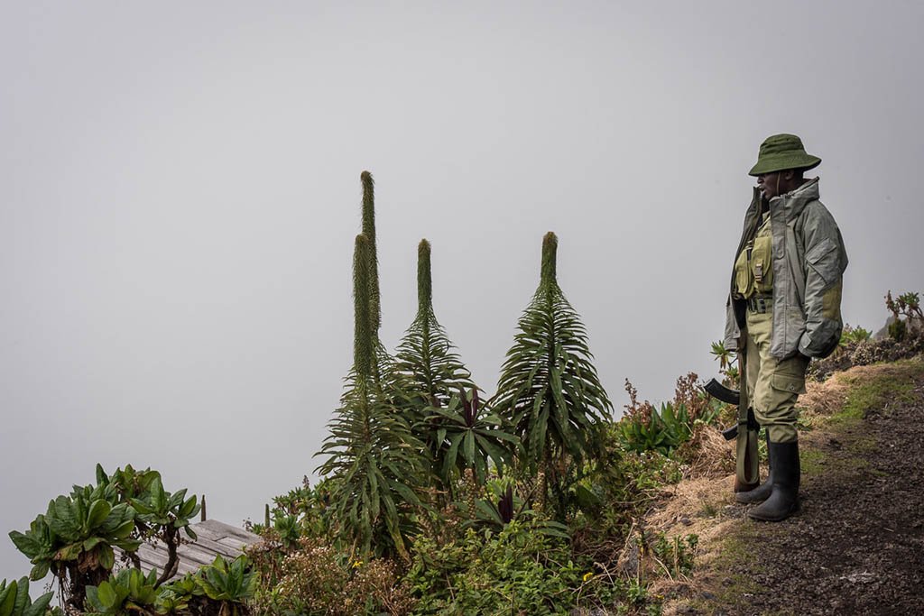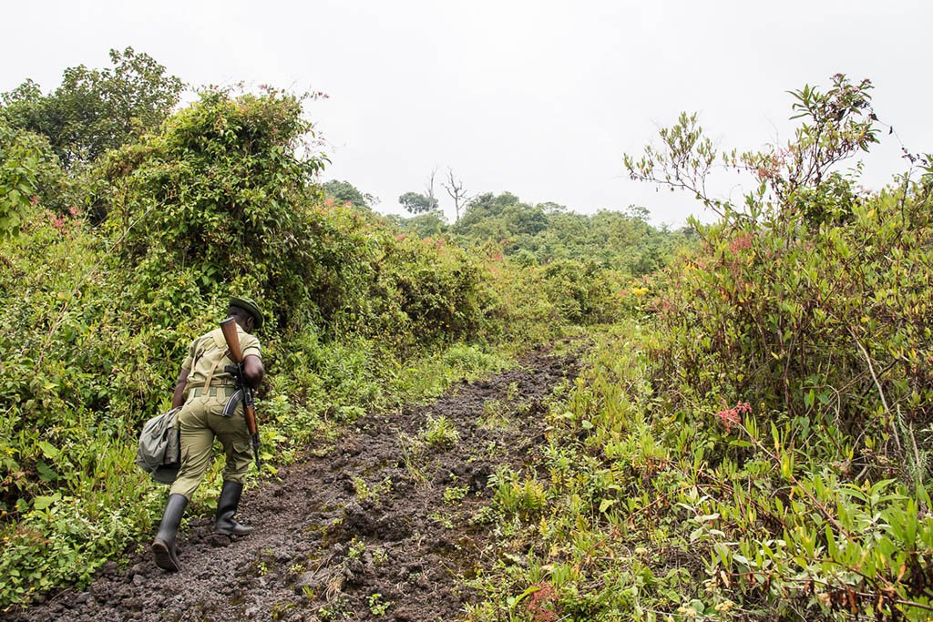 We set off at 9:30 am on the trail heading to the volcano after some instructions from one of the rangers. The current security situation in the Southern Virunga National Park around Nyiragongo was said to be stable allowing us to hike in a calm atmosphere surrounded by armed rangers in the front and the back. On the way up we came across three ranger outposts equipped with machine guns. Upto 30 rangers secure the trail up to the volcano, a tough job as there is no shelter and heavy rain falls almost every day. We were supposed to be a group of four this day, but another group of 12 from Czech Republic who had missed their ferry across Lake Kivu from Bukavo to Goma two days ago, joined us.