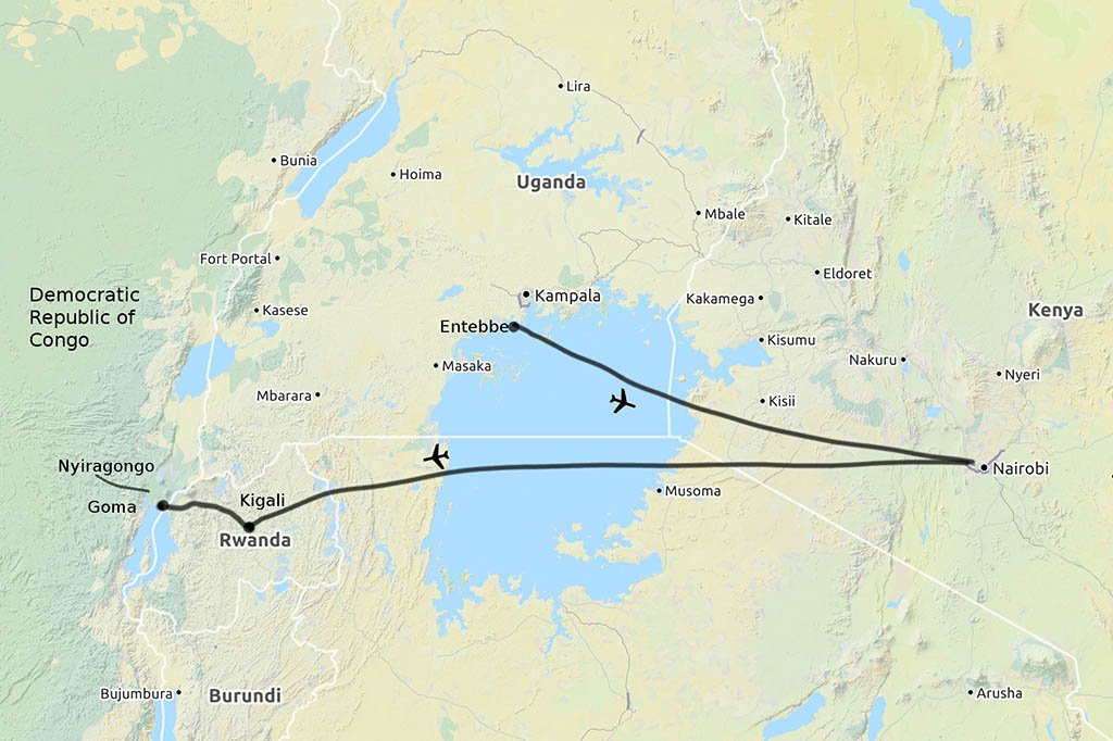 I took a flight to Kigali from Entebbe via Nairobi. From Kigali, I took a bus to Gisenyi, on the border with DRC. Getting an individual tourist visa to DRC can be burdensome, I left the formalities to the Virunga National Park (which organizes the trek to the volcano), and got mine within a day.