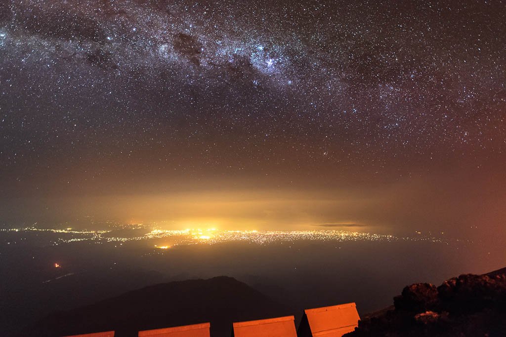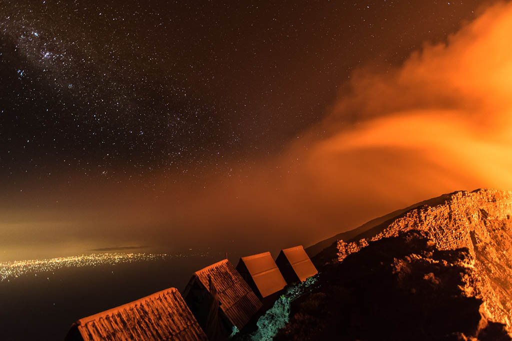 When we reached the crater rim, I was mesmerized by the view. Inside was a huge crater with a diameter of 1.2 km, hissing, simmering red hot lava and billowing smoke. As the sun went down, the scenery got even more spectacular. I spent almost all night at the rim watching the roaring waves of lava and the glowing smoke merging into the clouds illuminated by the moon. However, getting a closer look on the lava lake is rather difficult due to the instability of the rock that surrounds the crater. A rope, climbing equipment and a lot of courage is needed to get to the lower terrace inside the crater.