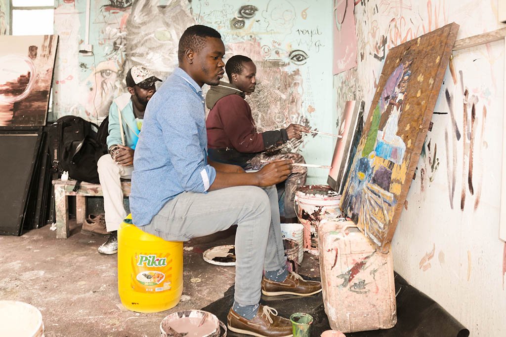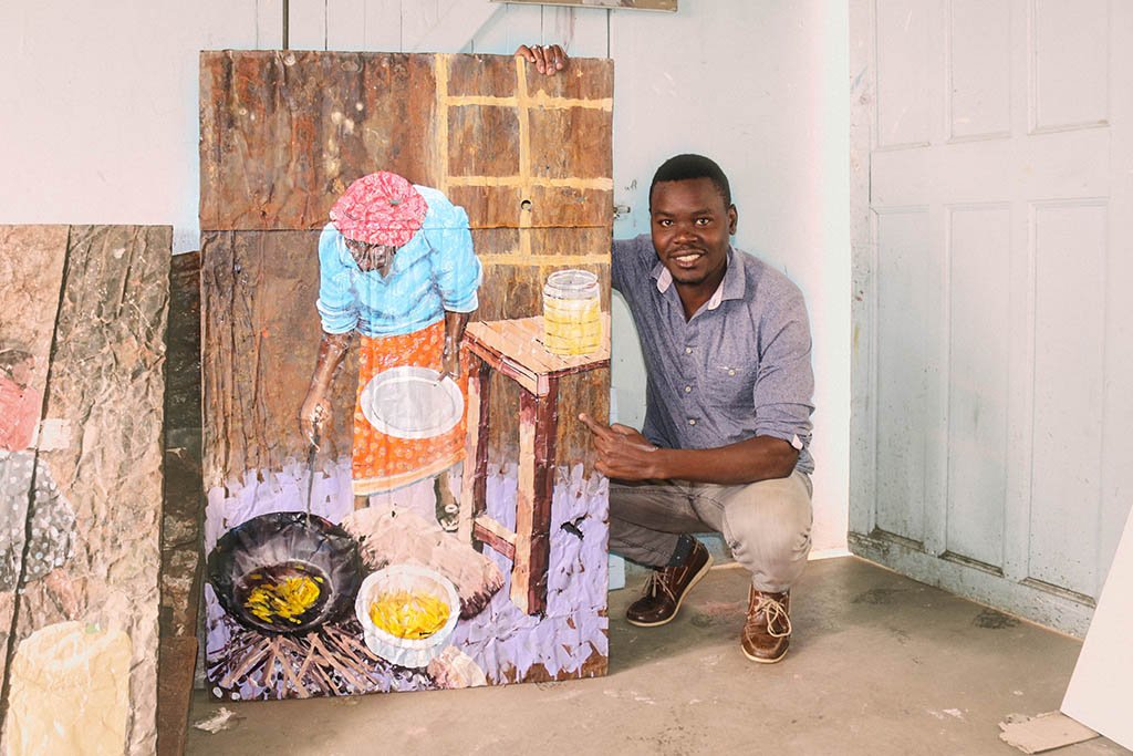 Born and raised in Mukuru, Adam is a widely travelled visual artist and has exhibited his works in disparate places from the Kakuma refugee camp in northern Kenya to the Czech Republic. He is also a humanitarian who is working tirelessly to alter the lives of people from the slums. He is the founder of an art studio in South B, where fine artists from the slums and surrounding areas can work from. The studio has become a work station of sorts; offering free art classes to children from ages 5-14, mentoring and horning skills of youths interested in pursuing a career in fine art and creating job opportunities for fine artists living within and around Mukuru. He also does workshops in schools where he conducts training on art related activities.