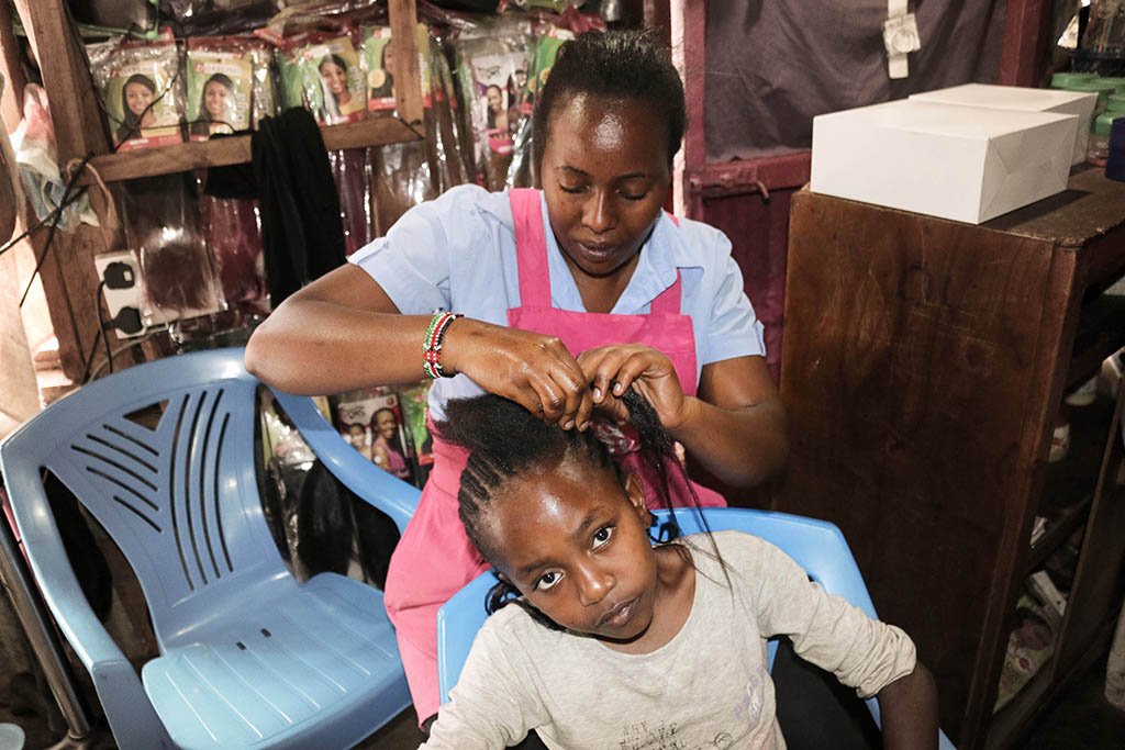 Hairdressers such as Priscilla are a fixture of the thriving micro enterprises that are found across slums in Kenya, reflecting both the enterprising nature of the people and demand from hair-conscious women (braided hair is as much fashion as convenience).