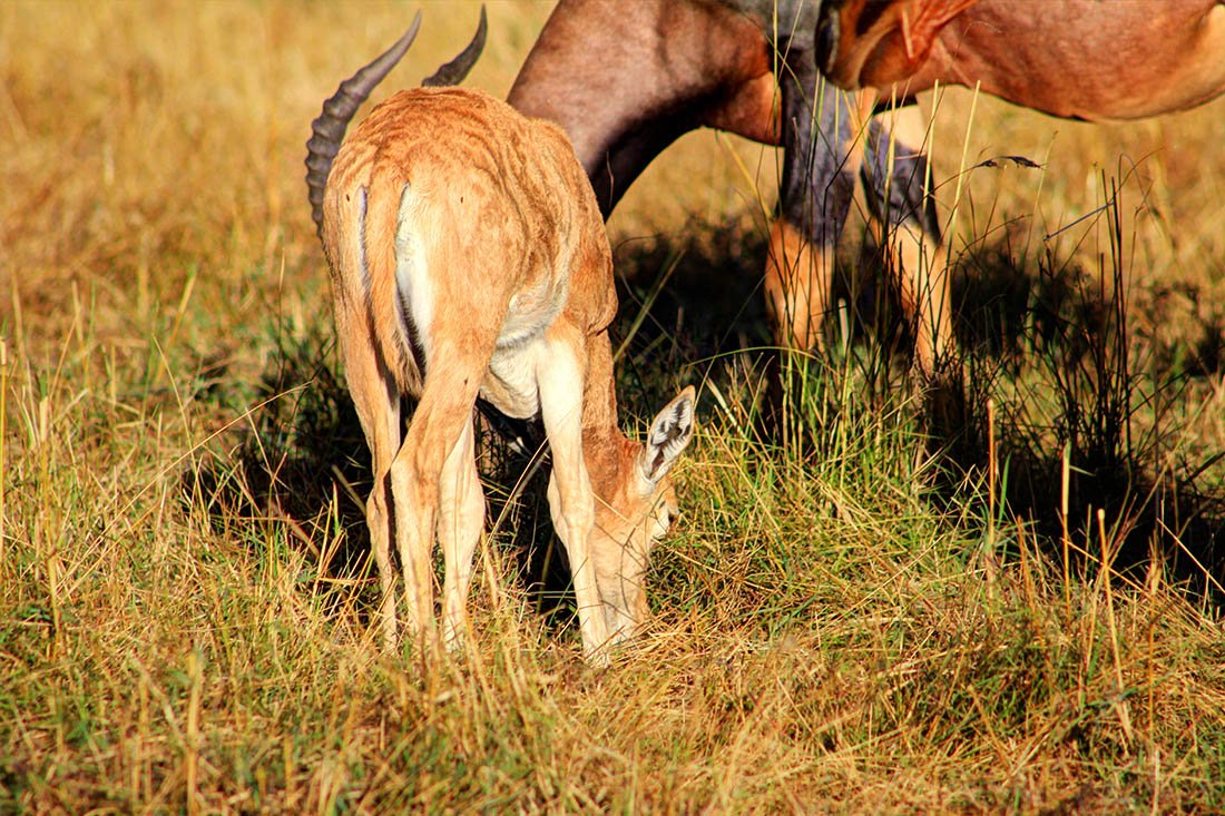 Maasai Mara_Topi calfTopi resemble hartebeest but have a darker coloration and lack sharply angled horns.