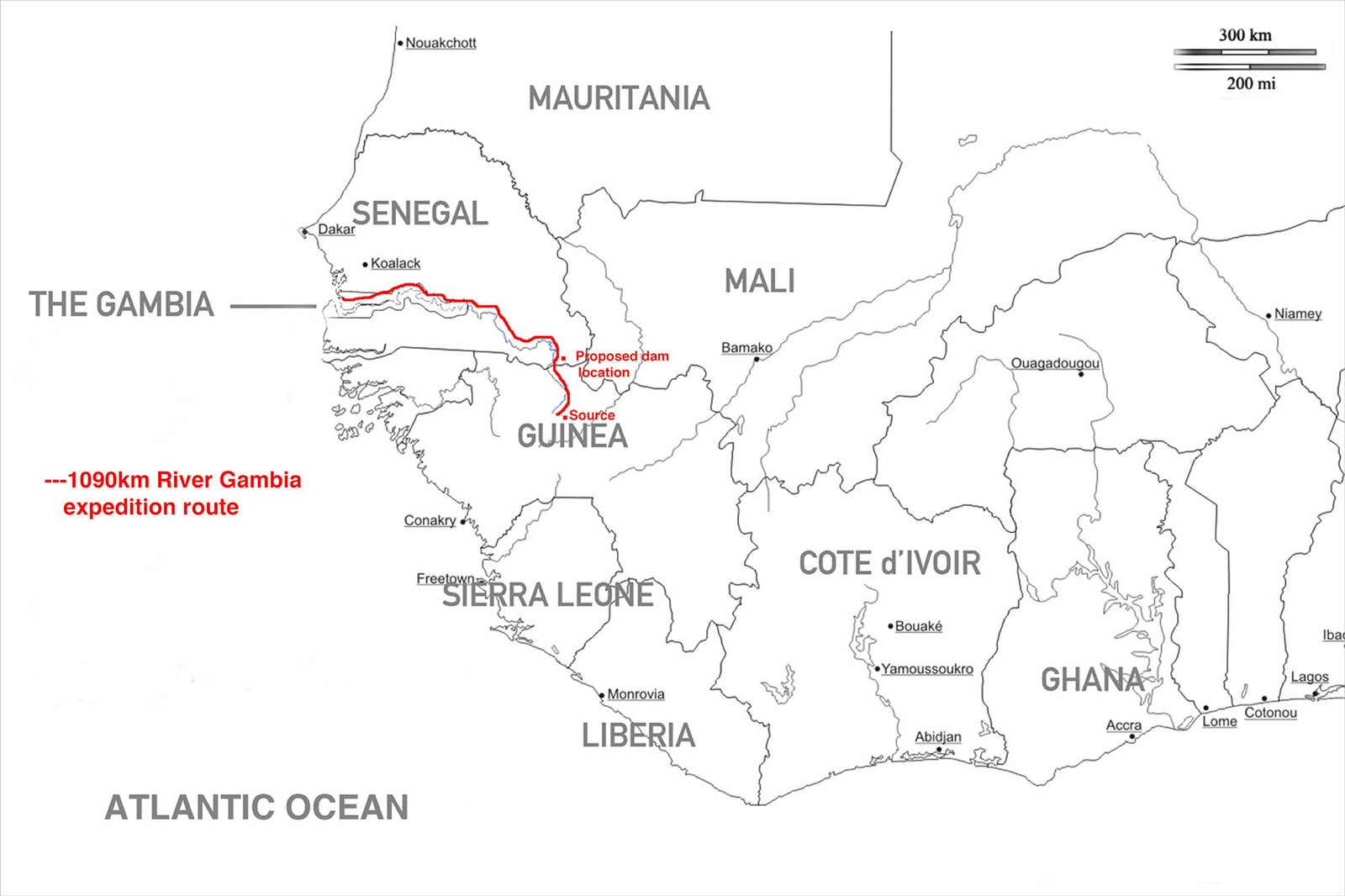 1090Km River Gambia expedition route