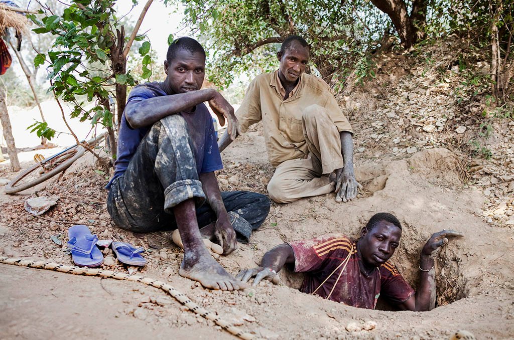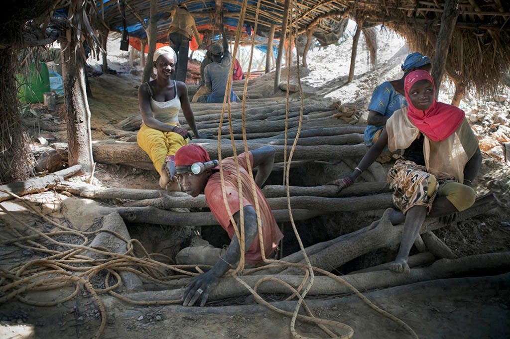 A Senegalese gold miner appears from the small shaft from where he is extracting gold bearing rocks. His two partners help haul the loaded bucket up to the surface. Mines shafts often collapse and many people are killed each year in their pursuit.