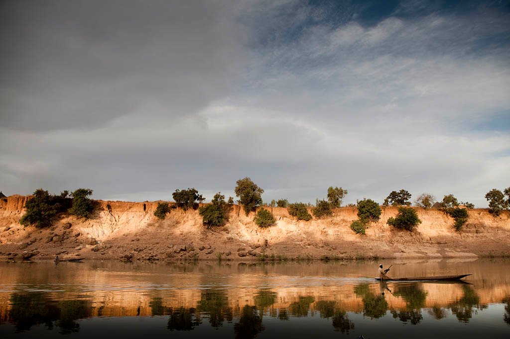 A fisherman paddles past the sandstone banks of River Gambia at Goloumbou, Senegal. The water level in the rainy season will reach close to the top of the banks