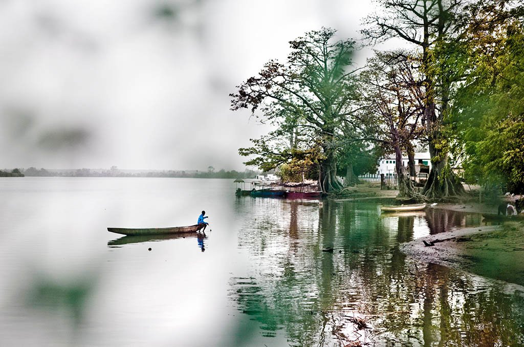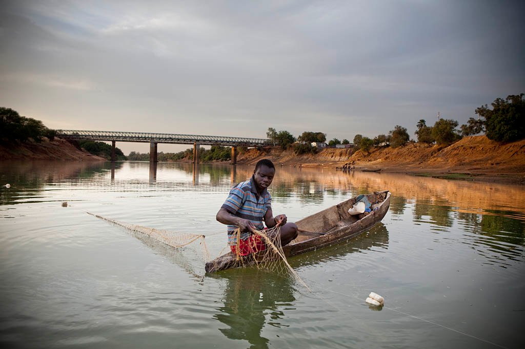 A fisherman on River Gambia at Goloumbou, Senegal. The water level in the rainy season will reach close to the top of the banks