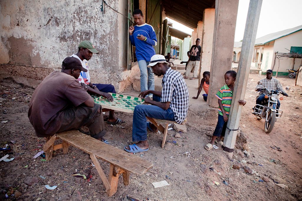 Men play draughts in the riverside village of Fatoto in the Upper River Region of the Gambia