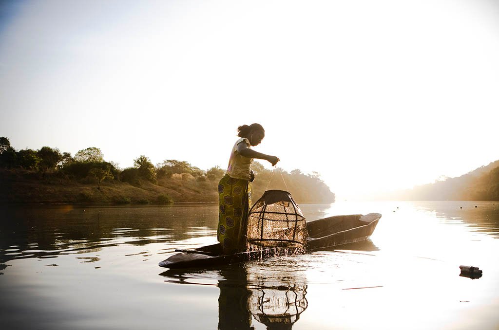 A migrant fisherwoman from Mali checks her fish traps near Fatoto, The Gambia
