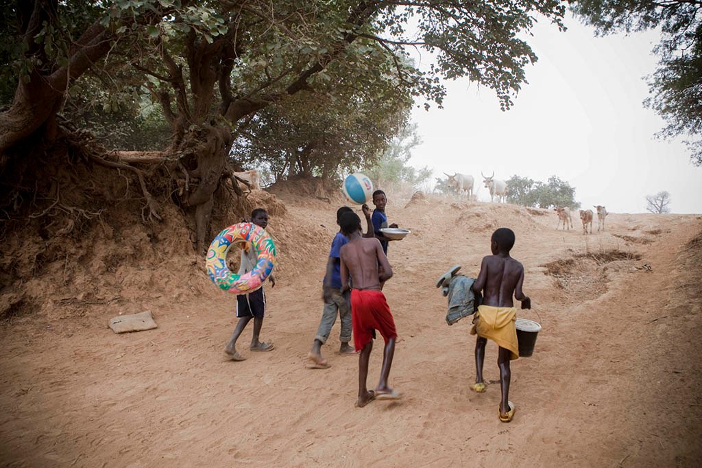 Boys head home after swimming in River Gambia at Fatta Tenda village, Gambia