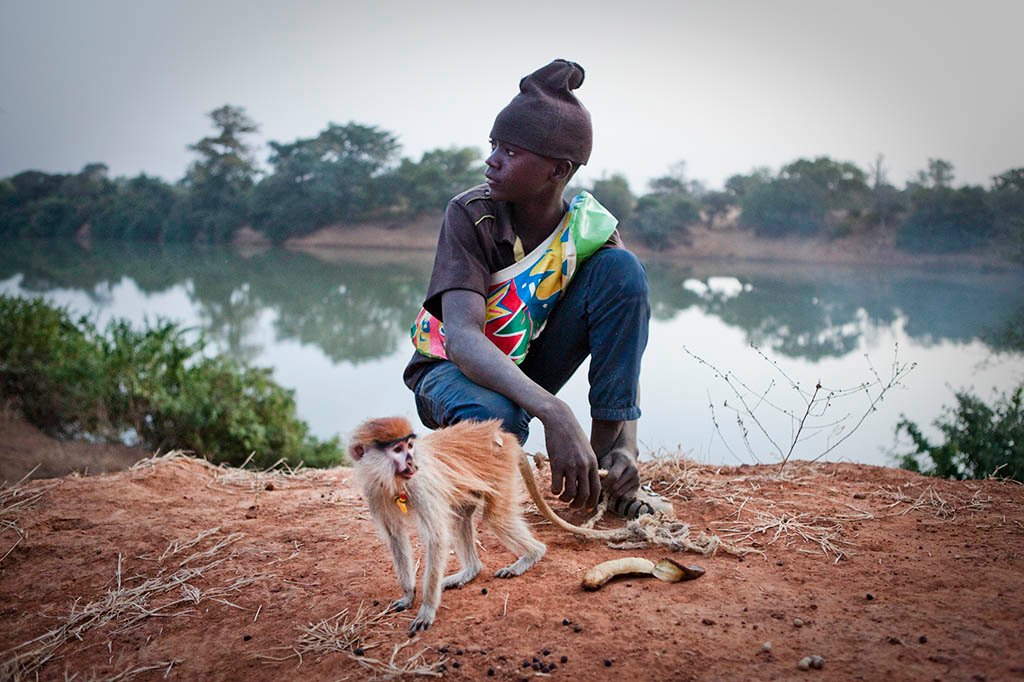 Musa with a rescued patas monkey on the banks of River Gambia at Fatta Tenda