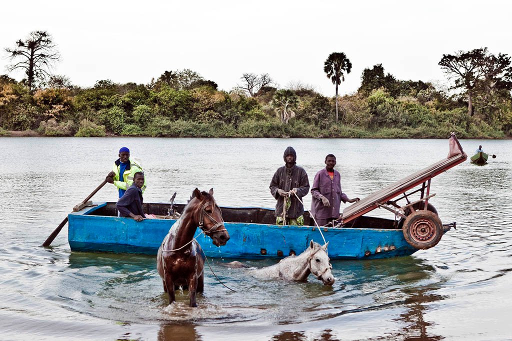 Small metal ferries, called ‘barras’ are the main way to cross the The River Gambia in the up-country regions of The Republic of The Gambia. Some ‘barras’ are motorized, but most are rowed across with a single paddle attached to the stern.