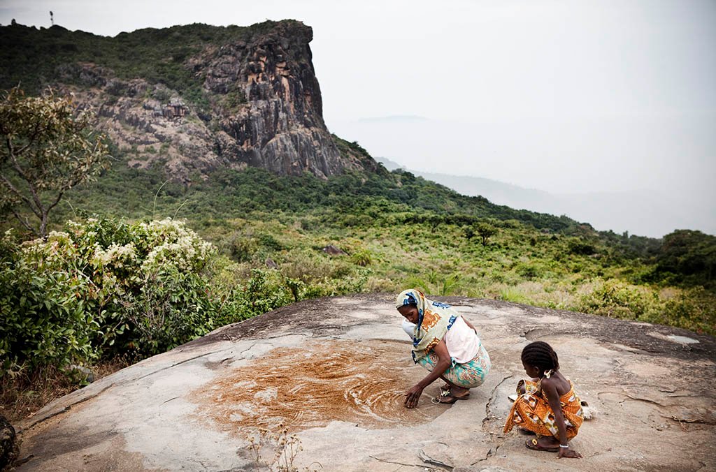 A mother and daughter lay cous out to dry on the rocks in the Fouta Djallon highlands of Guinea – source of the Niger, Senegal and Gambia river. In the background is the Dame de Mali, a rock formation in the profile of a woman – purportedly turned to stone for infidelity.
