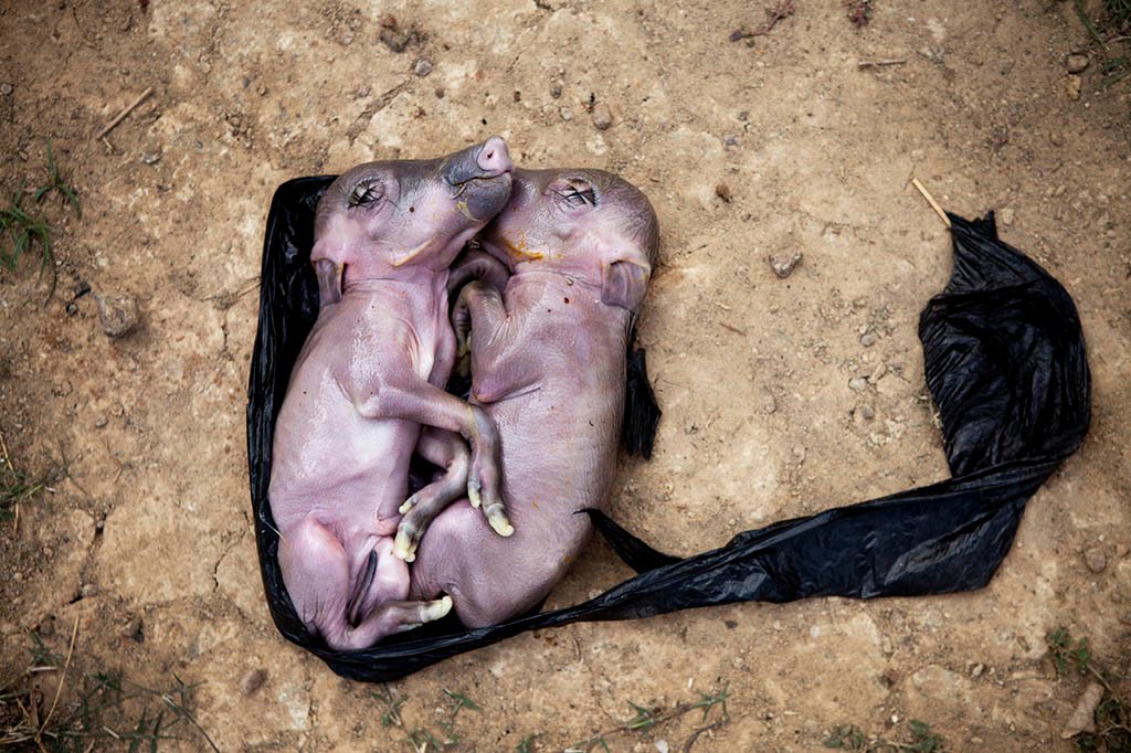Unborn pigs taken from the stomach of a hunted bush pig in Bansang, the Gambia