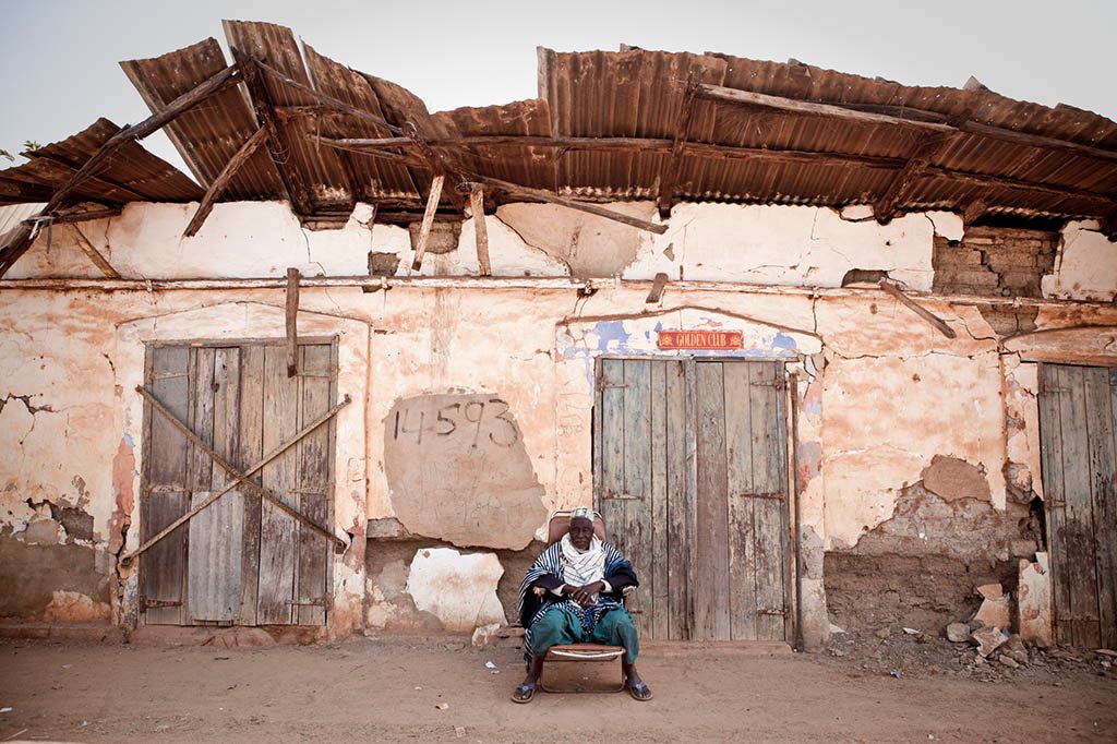 Momadou Camara, a village elder outside the facade of an old colonial era warehouse in the riverside town of Kuntaur. Kuntaur was until the 1980’s a prosperous town, but with the demise of the peanut trade in the area, and the relocation of a weekly regional market to Wassu, the town has fallen derelict in parts