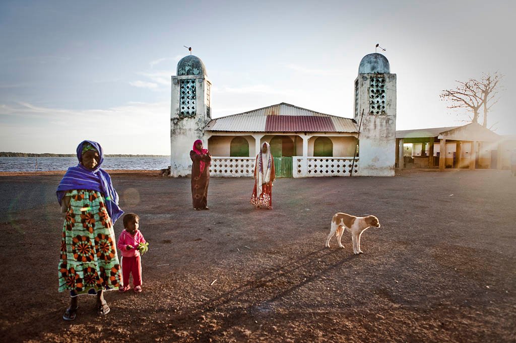 Women and a child in the early morning light in the Gambian riverside village of Tendaba meet and greet neighbors in front of the village mosque