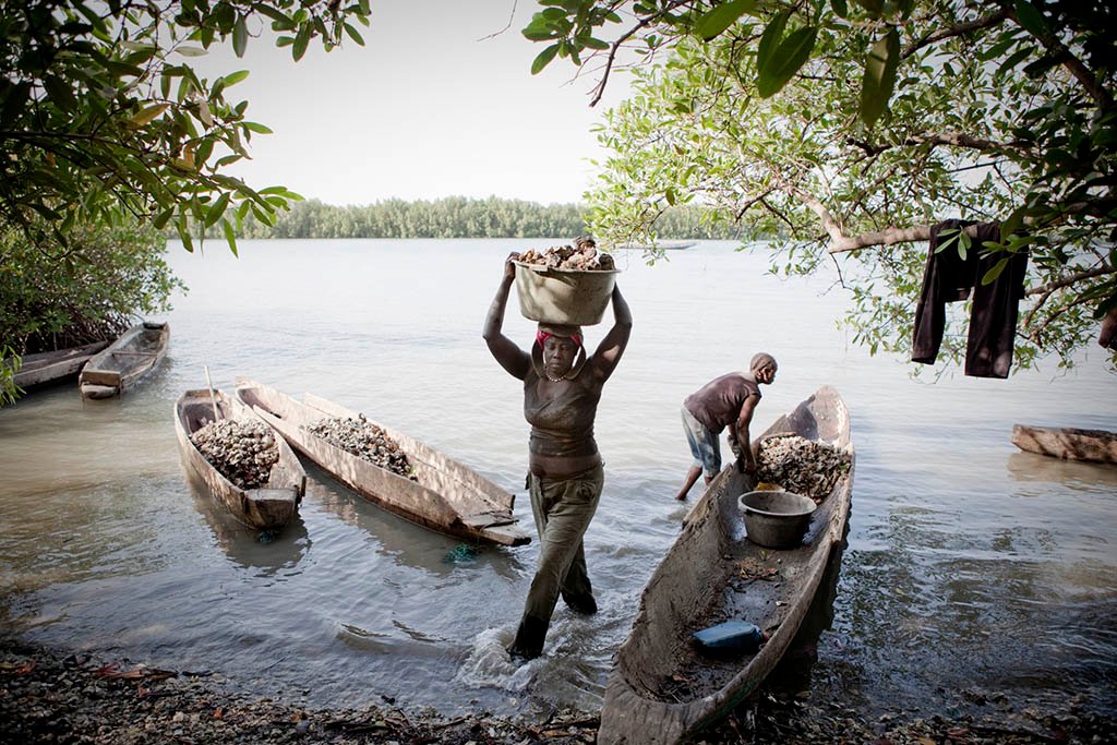 Female migrants from Guinea Bissau work along the shores of a tributary of River Gambia, in The Gambia, collecting oysters that hang from the mangrove