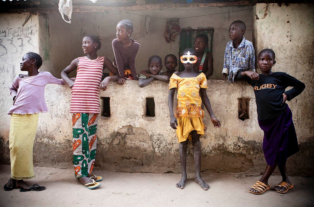 A young girl plays ‘dress-up’ with a Mardi Gras style masque in the village of Mandinari, a populous settlement on a ‘bolon’ (tributary) off the River Gambia.