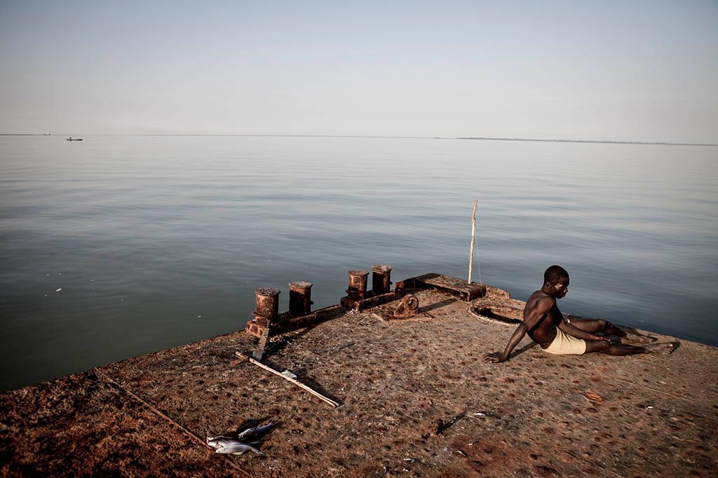 A watchman relaxes on a jetty at the Gambian village, Bonto. Bonto became infamous in 2009 when a two-tonne cocaine stash, with a street value of $1bn, was discovered in a riverside warehouse next to the jetty. The street value of the haul far exceeded Gambia’s $782 million annual GDP in 2009. The river at this point is 14km wide