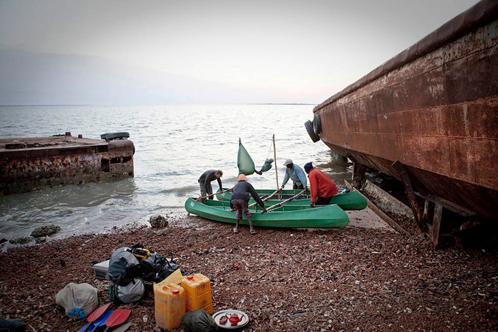 River Gambia expedition team prepare to launch ‘The Twins’ – (our two 6 meter canoes lashed together into a catamaran) into river Gambia on the penultimate day of our 1030km expedition