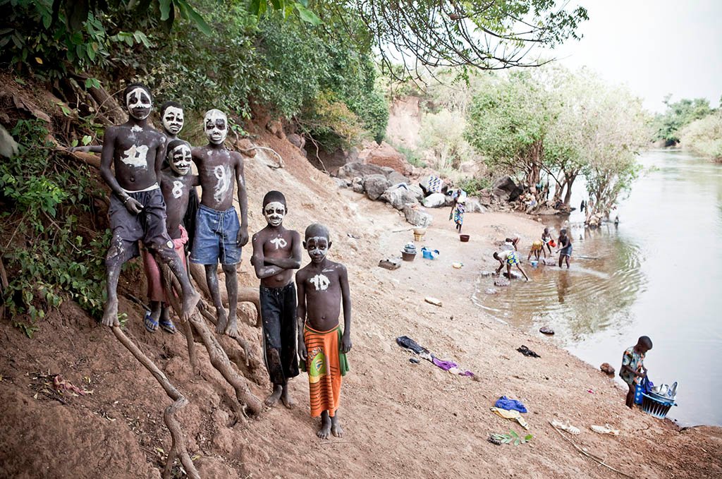 Young boys pose for a portrait on the banks of River Gambia in Senegal. They said they had painted their faces like skulls for their own amusement.
