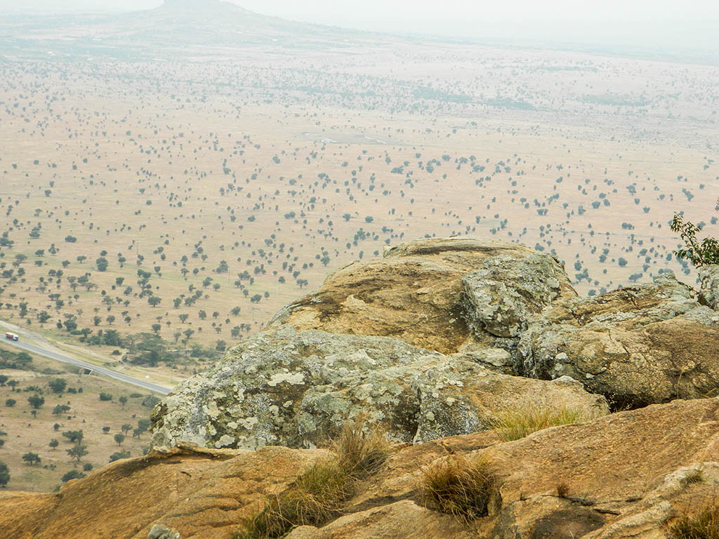 The hike consisted of a gentle ascent through the bushes and boulders. Once in a while the trail would break through the bushes to reveal distant views of traffic along the Nairobi – Mombasa highway. Gingerly stepping over the rocks, occasionally getting my feet caught in the winding not so clear trails, I steadily made my way up. With scattered dry land thorny bushes providing the only cover from the blistering sun an expansive rock section finally came into view.