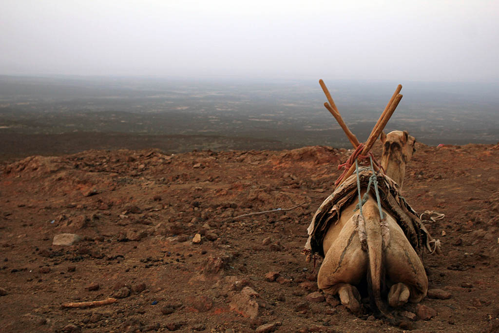 As soon as lunch was over, we hopped straight back into the heavens of our air-conditioned car. We had 35 kilometers to tackle. And in the desert, off-road, it would take about four hours. As the sun started to set we arrived at the military camp and once we had settled in and the sun had disappeared, the three camels were loaded with our mattresses and dinner, and we began our hike up to the crater of Erta Ale.