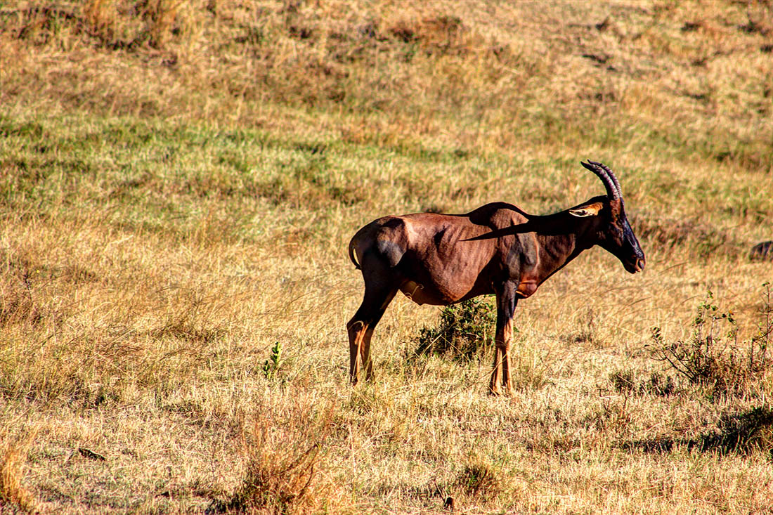 Maasai Mara_Topi calfTopi resemble hartebeest but have a darker coloration and lack sharply angled horns.